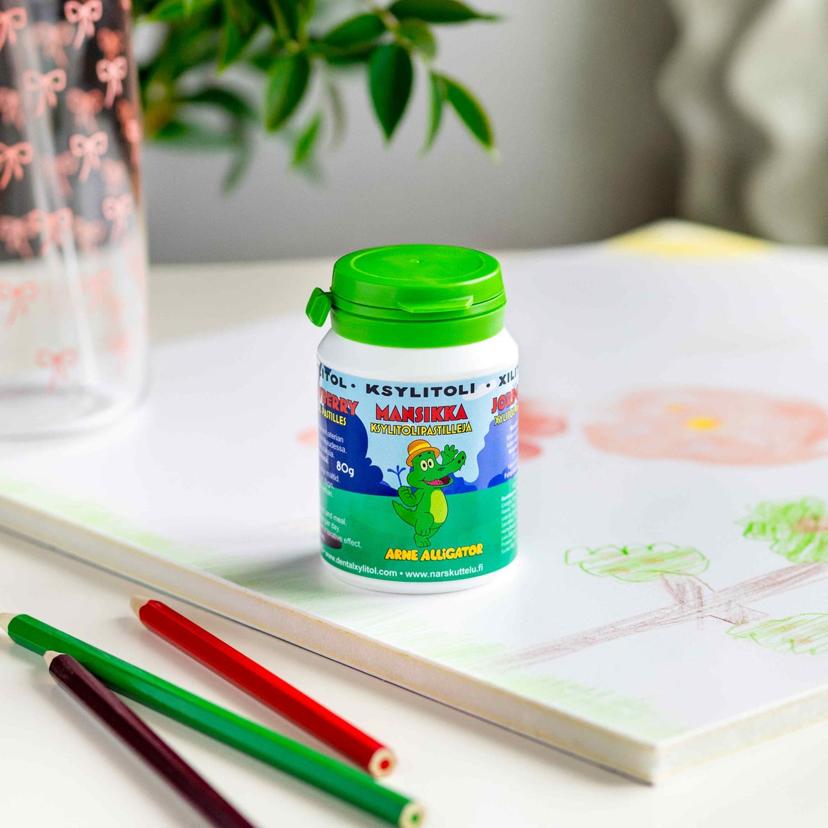 Etsitkö lasten suosikkia, joka sopii myös vanhemmille ja tekee hyvää hampailla? Aarne Alligaattori Mansikka ksylitolipastilli 80g tuo aurinkoisen kesän maun suuhun jokaisena päivänä, täysin ilman lisättyä sokeria. Mansikkainen xylitolipastilli uutuus on täydellinen valinta erityisesti lapsille ja kaikille niille, jotka rakastavat perinteistä ja pehmeää mansikanmakua sokerittomassa muodossa.